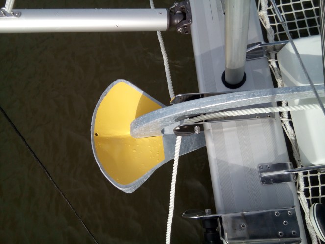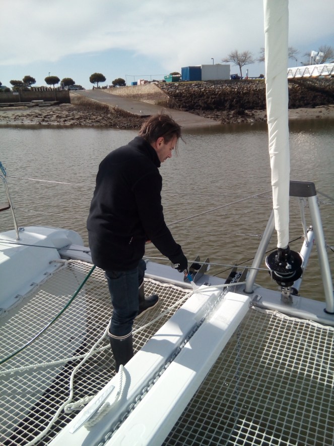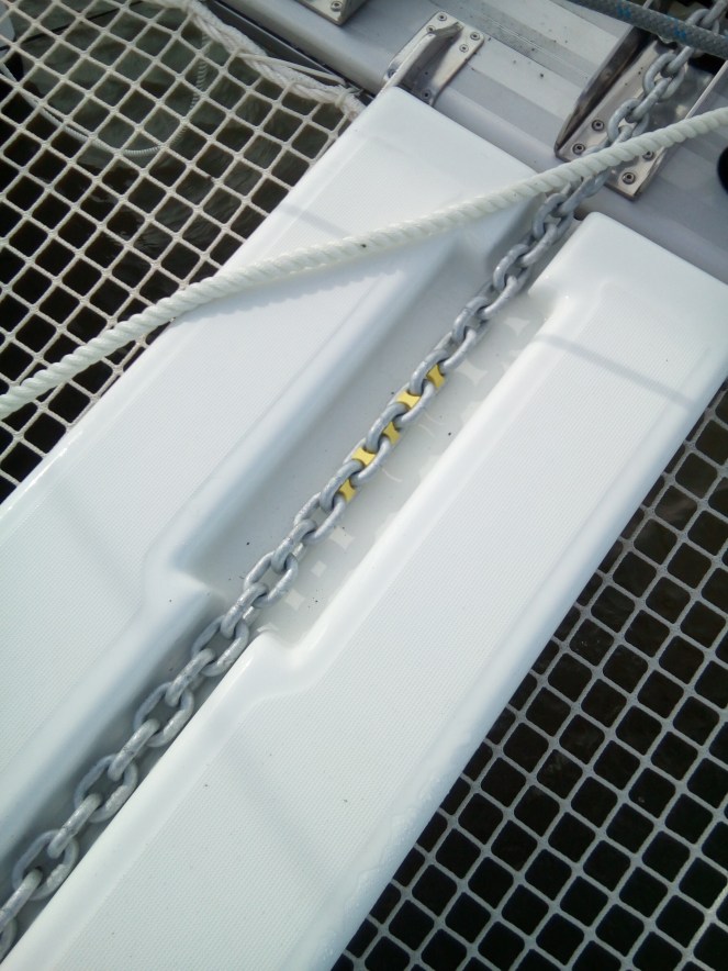 Poses de crochets dans un placard et surtout marquage de la chaine nous ont bien occupés. Nous avons marqué les 100 mètres de chaîne tous les 10 mètres et aussi passé du temps à bien la rincer, il y a plein de vase au fond du port…