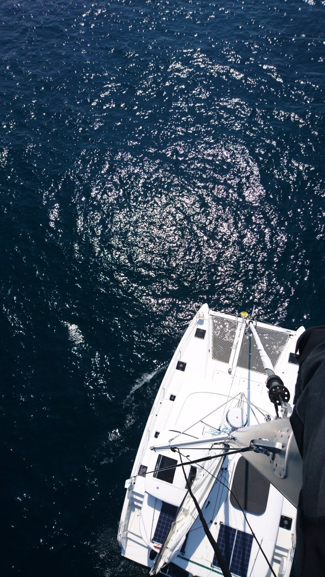 Le lendemain matin le dimanche toujours grand beau temps mais le vent a encore viré un peu plus sur notre arrière. Il n’y a plus de vent apparent, le génois n’est plus efficace, la décision est prise de monter au mât, tenter de repasser la drisse de spi pour retrouver de la vitesse. Tout ça en plein milieu du Golfe!
