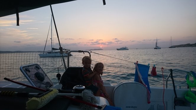 Le 29 août 2018, départ de bonne heure 7h30 ce matin pour rejoindre Ibiza. Et sera un Ibiza Express, en une moyenne de presque 7 nœuds, nous avons souvent vu 10 nœuds au compteur et c’est plutôt rare. Bref bonne navigation rapide mais un peu remuant quand même, ce qui n’a pas empêché Solveig et Owen de travailler avec papa. Mouillage bien agréable à Portimatx dès 15h. Baignade et belle vue au programme du reste de l’après midi.
